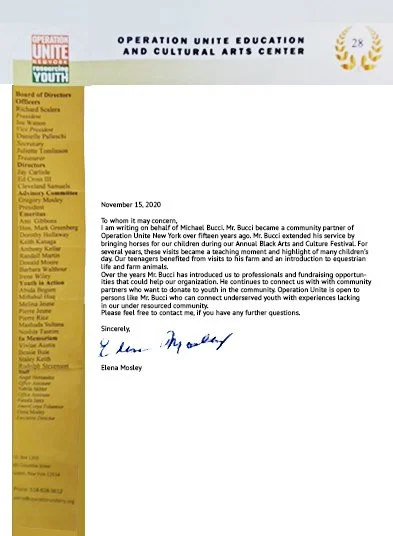 Operation Unite Education and Cultural Arts Center Testimonial “Our teenagers benefited from visits to his farm and an introduction to equestrian life and farm animals.” Read the letter